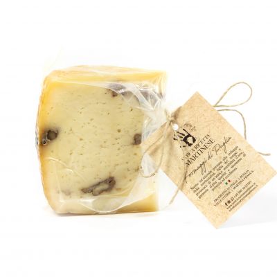 Forma di cacio stagionato di impreziosito da gherigli di noci di qualità.
